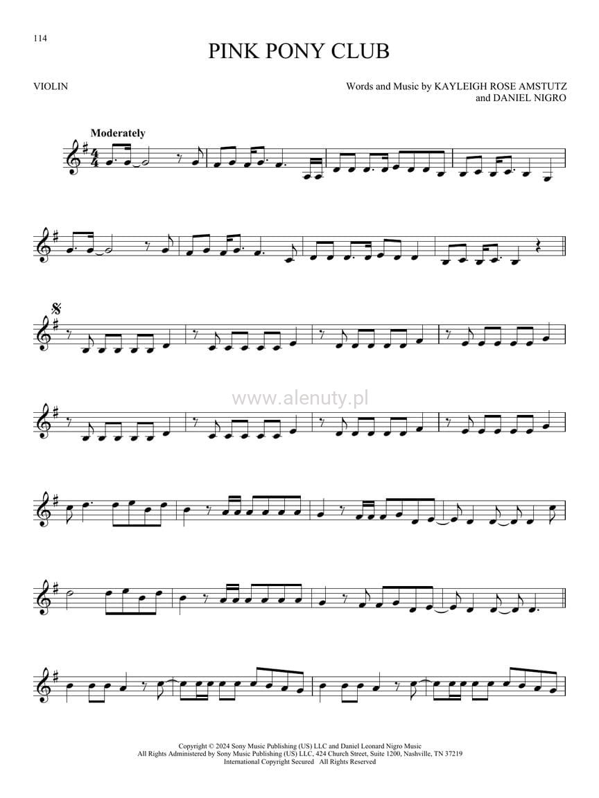 Tup nogą do rytmu i graj razem z tymi znanymi przebojami dzięki 101 Top Hits for Violin! Ta kolekcja jest pełna przebojów z pierwszych miejsc list przebojów i wirusowych faworytów, wszystkie starannie zaaranżowane na twój instrument. Zróżnicowany i popularny, pełen ulubionych utworów, ten śpiewnik jest idealny dla graczy, którzy chcą budować pewność siebie podczas zabawy! Naucz się grać utwory, do których publiczność może śpiewać, dzięki starannie dostosowanym aranżacjom solowym. Niezależnie od tego, czy występujesz na żywo, czy ćwiczysz w domu, z przyjemnością dodasz te utwory do swojego repertuaru! Coś na każdy nastrój i styl Twoja publiczność zatańczy na scenie w szpilkach do Pink Pony Club, złoży oświadczenie z I'm Just Ken i poczuje miłość z Thinking Out Loud. Dzięki 101 kultowym piosenkom, zawsze jest coś świeżego do zagrania! Początkujący i średniozaawansowani Ta łatwa do grania kolekcja zawiera uproszczone rytmy, przystępne sygnatury klawiszy i wygodne zakresy nut. Zaprojektowane z myślą o solowych instrumentalistach, te aranżacje są zarówno przystępne, jak i wciągające, dzięki czemu świetnie nadają się do ćwiczeń, występów i osobistej przyjemności. Chwyć za skrzypce, przewróć stronę i spraw, by wszyscy śpiewali razem z tobą!