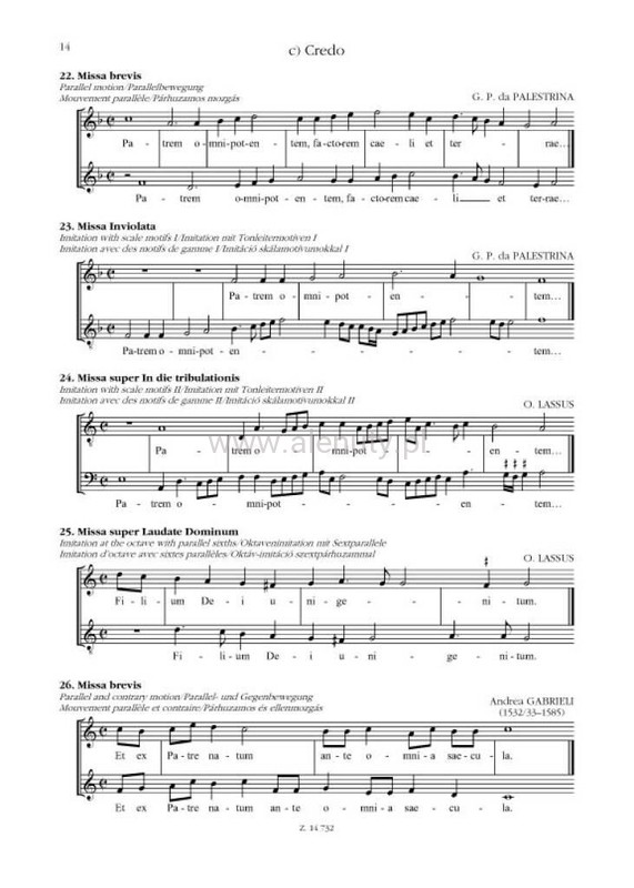 This collection, similarly to the publication entitled 111 bicinia from the 15th century (EMB 14478), contains longer and shorter two-part excerpts from polyphonic ecclesiastical choral works, for pedagogical and liturgical use. As teaching material, on the one hand it introduces and notes in brief textual definitions the characteristics of each given excerpt: on the other hand, it provides easily usable examples for teaching music history, solfege and counterpoint (practice of intervals, score-reading, dictation, stylistic exercises, etc.) At the same time the movements, which also function as independent units, can be quickly learnt, and may on occasions add colour to the musical palette of the liturgy by introducing material that can be performed even by a children's choir. The volume consists mainly of excerpts taken from Mass movements and Magnificats by Palestrina, Lassus, Gombert, Clemens non Papa and others. A separate chapter is devoted to chorale-based bicinia in German, which were already popular in the initial period of Evangelical church music.