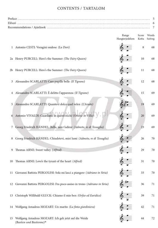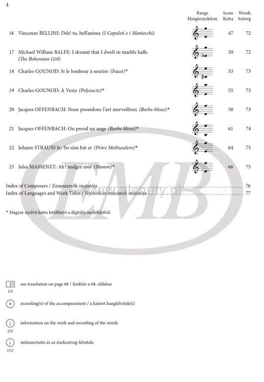 A Panorama of Arias zawiera wybór arii z oper, operetek i dzieł oratoryjnych z XVII-XIX wieku w oryginalnym języku dla osób uczących się śpiewu na poziomie początkującym i średnio zaawansowanym. Wszystkie arie posiadają nowe, łatwe do wykonania opracowania fortepianowe, a niektóre z nich zawierają nawet fragmenty recytatywów. Do nut dołączone są: - profesjonalne nagrania audio akompaniamentów fortepianowych i orkiestrowych na autentycznych instrumentach, - nagrania audio native speakerów czytających słowa arii, - dosłowne tłumaczenia słów w języku angielskim i węgierskim, - informacje o utworach. Nagrania audio i informacje o utworach są swobodnie dostępne dzięki unikalnemu kodowi, który można znaleźć w wydaniu drukowanym. Dr Katalin Hegedüs-Gönczy jest repetytorem w Pál Járdányi School of Music w Budapeszcie i redaktorem serii nutowej A Panorama of Songs.