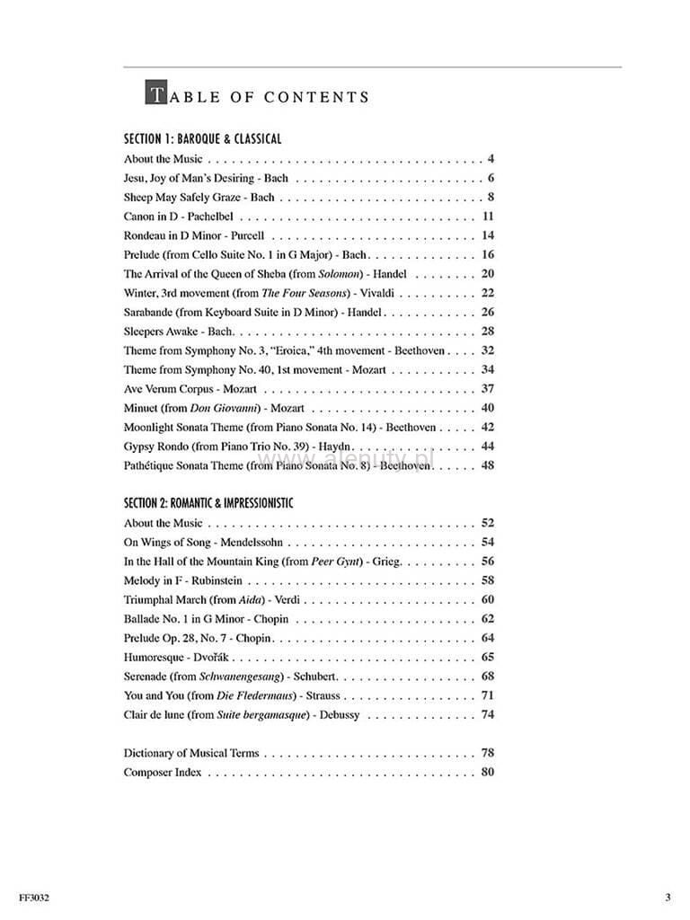 Publikacja zawiera bogaty zbiór repertuaru klasycznego część 2, który jest idealnym uzupełnieniem popularnej serii Faber Adult Piano Adventures. Arcydzieła zawarte w tym tomie zapewnią wiele godzin przyjemnej nauki i zabawy. Książka ta jest idealna do wykorzystania wraz z podręcznikami metodycznymi Adult Piano Adventures lub jakąkolwiek inną metodą gry na fortepianie dla dorosłych. Wszystkie prezentowane utwory są zaaranżowane na odpowiednim poziomie dla dorosłych początkujących.