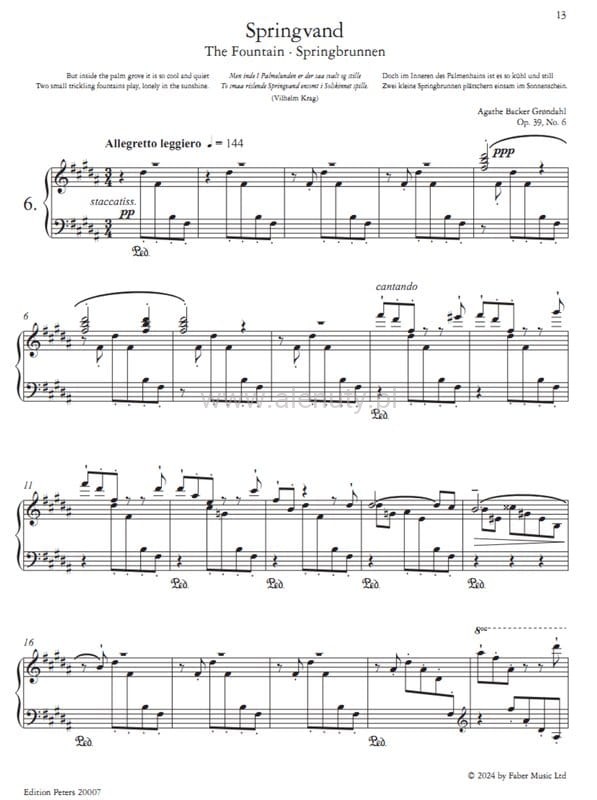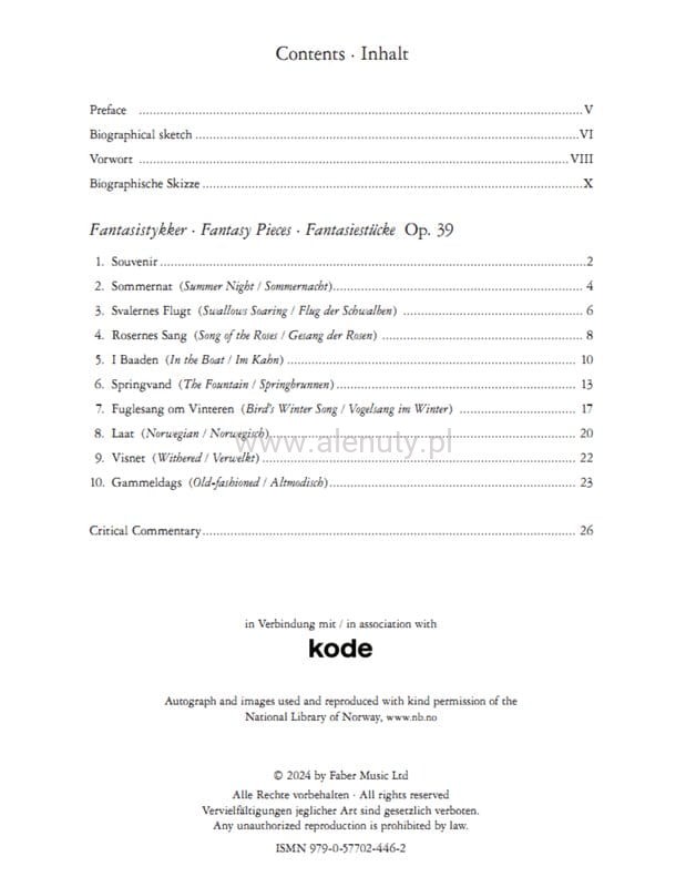 Agathe Backer Grøndahl jest przede wszystkim znana jako znakomita norweska pianistka, ale jej genialne kompozycje do tej pory nie cieszyły się zbyt dużym zainteresowaniem. Fantasy Pieces op. 39 zawierają jedne z jej najbardziej udanych utworów fortepianowych, które urzekają oryginalnym i częściowo impresjonistycznym językiem tonalnym. Pierwsze w historii wydanie Urtext, zredagowane przez Christiana Grøvlena, po oryginalnym wydaniu z 1896 roku, które było niedostępne przez wiele lat. Agathe Backer Grøndahl jest przede wszystkim znaną norweską pianistką, choć jej mistrzowskie kompozycje do tej pory cieszyły się niewielkim zainteresowaniem. Die Fantasiestücke op. 39 zawiera jedne z jej najsłynniejszych Klavierwerke, które charakteryzują się oryginalną i impresjonistyczną tonacją. Erste Urtext-Ausgabe, herausgegeben von Christian Grøvlen, basierend auf der Originalausgabe von 1896.