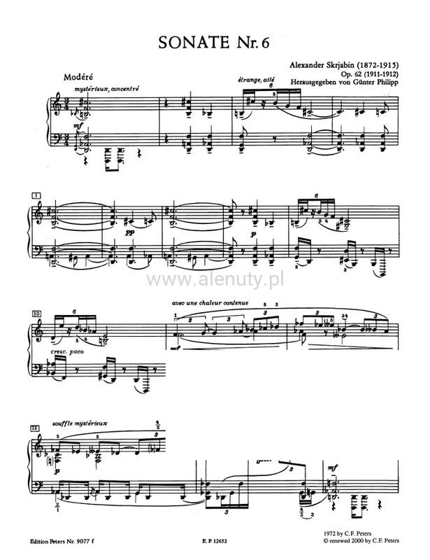 Alexander Scriabin composed sets of Études throughout his life in all periods of his compositional development. These pieces push the technical limits while finding new musical and poetic vistas. This edition is volume 6 of his Selected Piano Works, including Sonatas No. 6-10 (Op. 62, 64, 66, 68 and 70) which have been prepared by Günter Philipp. It contains an authoritative text of the notation, preface in German and English, and a critical commentary.