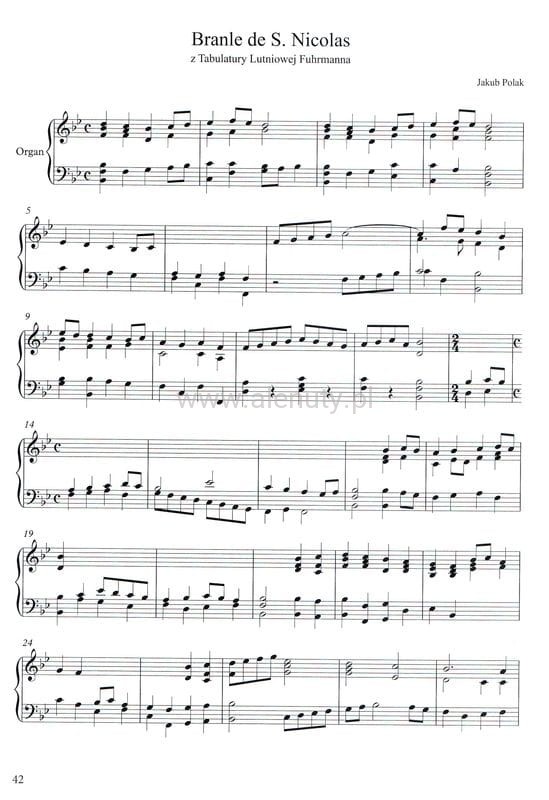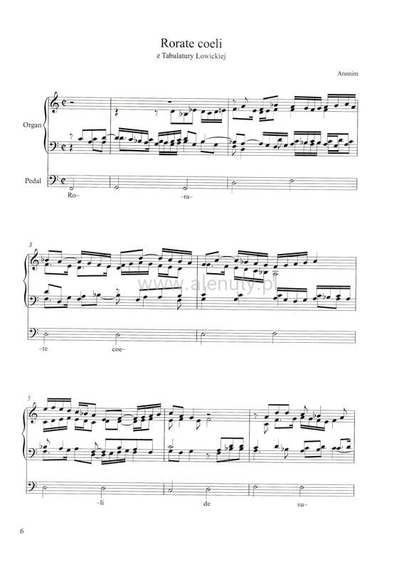 „Angelus in G”, „Fuga in d”, „Fuga in G”, „Magnificat, anima mea, Magnificat primi toni”, „Quia respexit, Magnificat primi toni”, „Et misericordia eius, Magnificat primi toni”, „Deposuit, Magnificat primi toni”, „Suscepit, Magnificat primi toni”, „Gloria Patri, Magnificat primi toni”, „Narodził się Syn Boży”, „Nużeśmy chrzescijanie”, „Płaczże dzisiaj”, „Przez Twoje święte zmartwychwstanie”, „Puer natus in Bethleem”, „Wesoły nam dzień dziś nastał”, „Preludium in d”, „Preludium primi toni”, „Sapientiam Sanctorum”, „Toccata terti toni”, „Toccata in a”