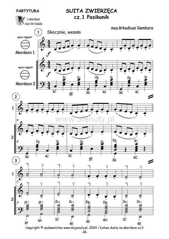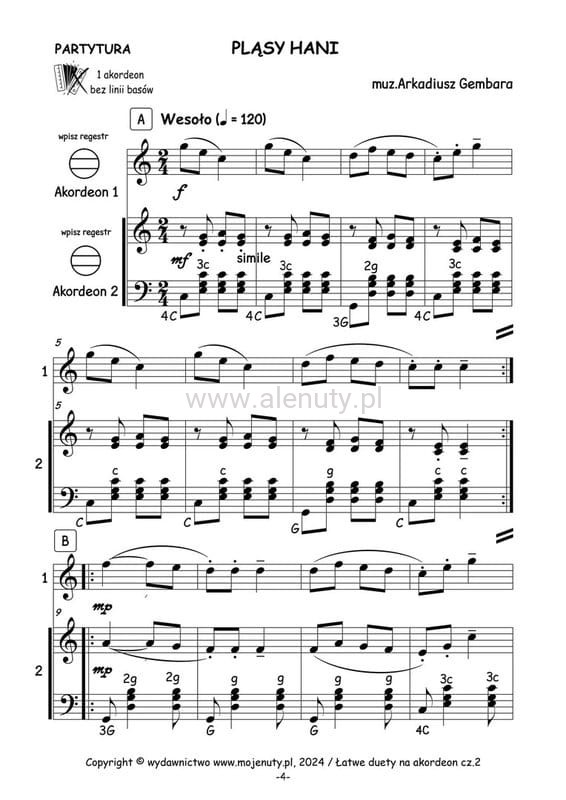 "Łatwe duety na akordeon cz. 2" to zbiór utworów na akordeon dla dzieci i młodzieży na poziomie 3-6 klasy szkoły muzycznej i innych muzycznych placówek edukacyjnych i artystycznych. Publikacja jest owocem pasji kompozytora do nauczania oraz miłości do muzyki, stworzony z myślą o młodych akordeonistach (kl.2-6), zarówno początkujących, jak i tych już nieco bardziej zaawansowanych. Autor od lat pracuję z dziećmi i młodzieżą, ucząc ich tajników gry na akordeonie, co pozwoliło zrozumieć, jak ważne jest dostarczanie materiałów, które nie tylko rozwijają umiejętności, ale również sprawiają radość z muzykowania. Z tego powodu Arkadiusz Gembara zdecydował się podzielić swoim doświadczeniem i stworzyć kolekcję, która zachęci młodych akordeonistów do wspólnego tworzenia muzyki. Niektóre z utworów w tej publikacji są rozwinięciem materiału zawartego we wcześniejszych pracach kompozytora, co czyni je doskonałym uzupełnieniem edukacyjnym. Dając wykonawcom swobodę interpretacyjną, autor pragnnie zaszczepić w nich kreatywność i własne podejście do muzyki, co jest nieocenione w rozwijaniu ich artystycznych skrzydeł.