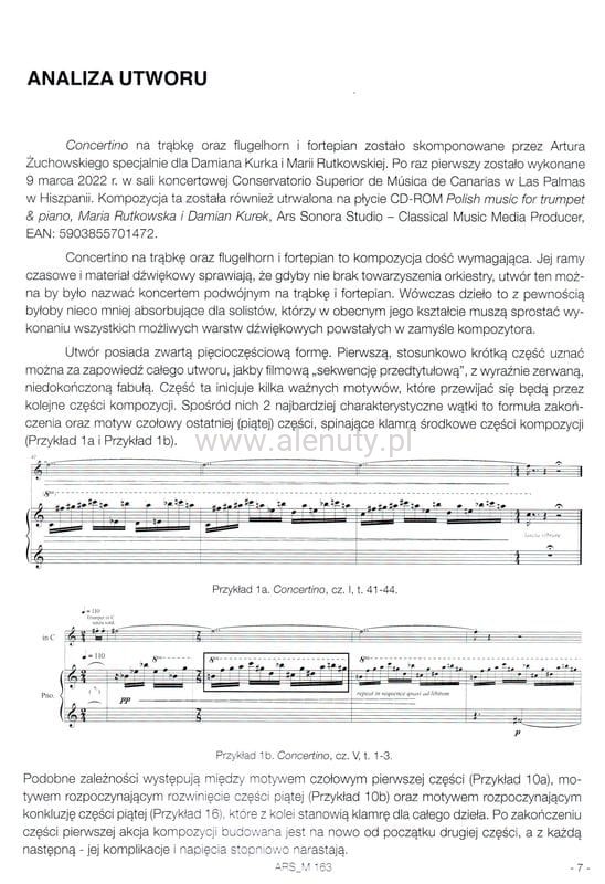 Concertino na trąbkę i fortepian zostało skomponowane specjalnie dla Damiana Kurka i Marii Rutkowskiej. Jest to dość wymagająca kompozycja składająca się z 5 części. Wydanie wzbogacone zostało o dokładny opis poszczególnych części oraz o dogłębną analizę muzyczną utworu. Nuty przeznaczone dla średnio zaawansowanych muzyków.
