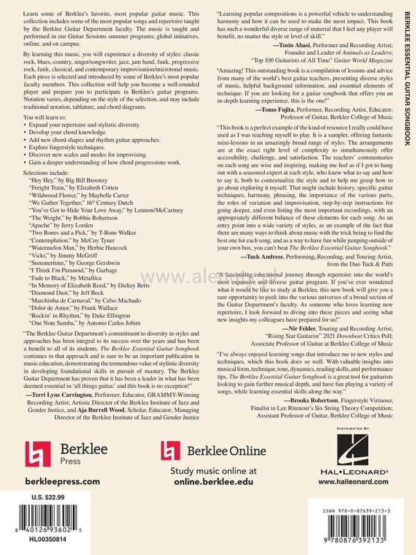 "Naucz się ulubionej i najpopularniejszej muzyki gitarowej Berklee. Zbiór ten zawiera niektóre z najpopularniejszych piosenek i repertuaru nauczanego przez wydział gitary Berklee. Muzyki uczy się i wykonuje w ramach letnich programów Guitar Sessions, inicjatyw globalnych, online i na terenie kampusu. Ucząc się tej muzyki, doświadczysz różnorodności stylów: klasycznego rocka, bluesa, country, piosenkarza/autora tekstów, jazzu, jam bandu, funku, rocka progresywnego, funku, klasyki i współczesnej muzyki improwizowanej/mikrotonowej. Każdy utwór jest wybierany i przedstawiany przez najpopularniejszych wykładowców Berklee. Ta kolekcja pomoże Ci stać się wszechstronnym graczem i przygotować Cię do udziału w programach gitarowych Berklee. Notacja różni się w zależności od wybranego stylu i może obejmować tradycyjną notację, tabulaturę i diagramy akordów. 20 piosenek, w tym: Apache (Jerry Lorden) · Freight Train (Elizabeth Cotten) · Hey Hey (Big Bill Broonzy) · Two Bones and a Pick (T-Bone Walker) · We Gather Together (holenderska piosenka z XVI wieku) · The Weight (Robbie Robertson) · Kwiat dzikiego drewna (Maybelle Carter) · Miłość musisz ukryć (Lennon/McCartney) · i nie tylko.