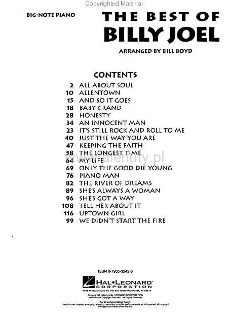 Publikacja zawiera 19 najbardziej znanych piosenek Billy Joela w łatwych opracowaniach na fortepian dla początkujących wykonawców.