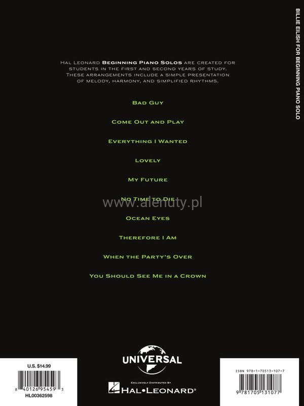 Tytuł: Billie Eilish for Beginning Piano Solo - 10 piosenek