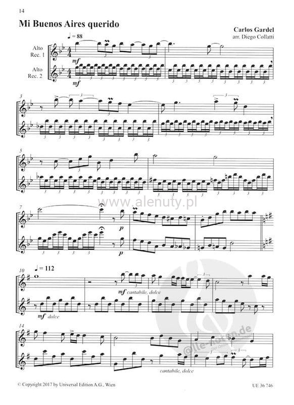 Pozycja z serii 'World Music' zawiera kolekcję klasycznych tango Carlosa Gardela, w aranżacji Collatti Diego Marcelo na dwa flety proste.