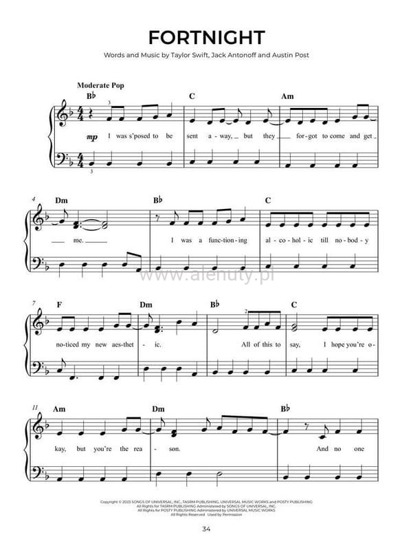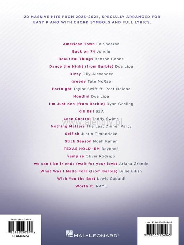 20 ogromnych hitów z lat 2023–2024, specjalnie zaaranżowanych na łatwy fortepian z symbolami akordów i pełnymi tekstami. Zawiera „Beautiful Things”, „Fortnight”, „Stick Season”, „Vampire” i wiele innych, w tym trzy największe hity ze ścieżki dźwiękowej Barbie z 2023 roku!