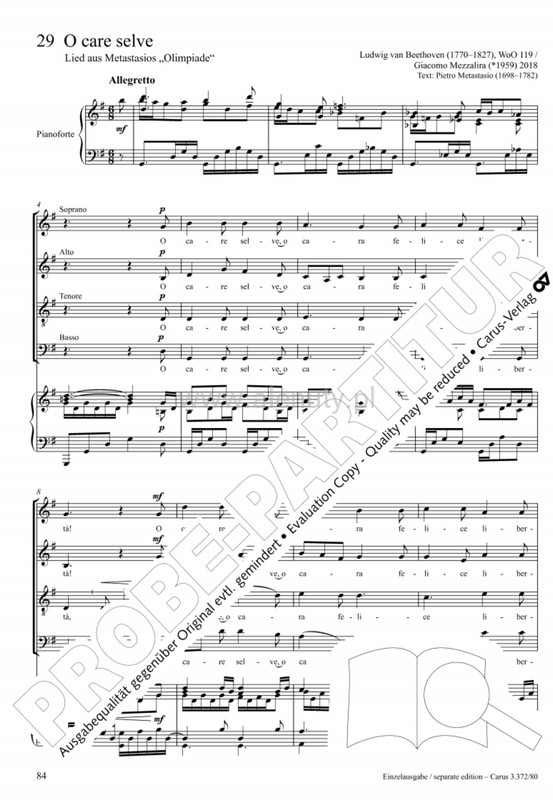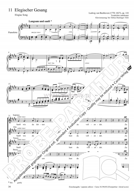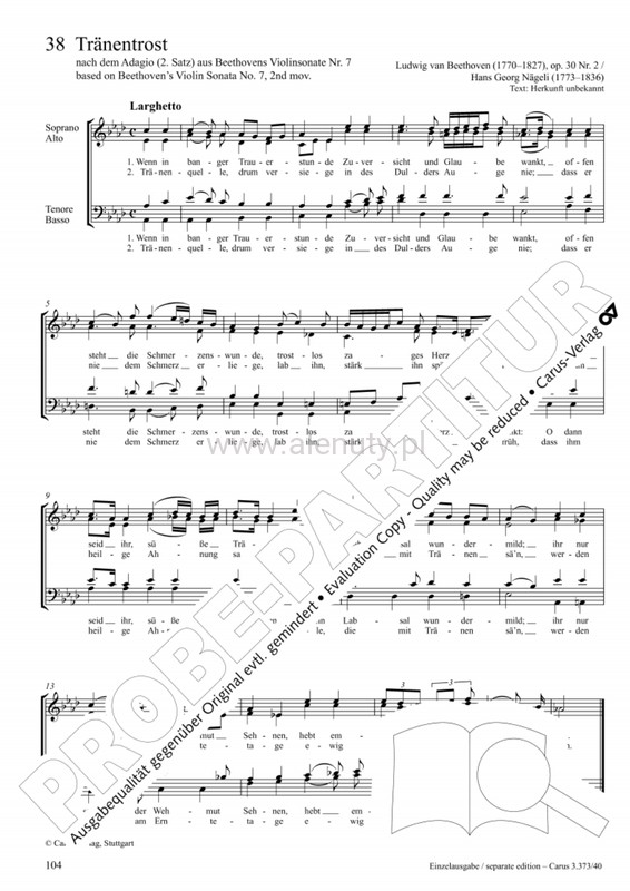The anniversary edition for all choirs! With their extensive forces and complex parts, the performance of Beethoven’s choral-symphonic works is hugely demanding for many choirs. For the major Beethoven anniversary in 2020 Carus is therefore expanding the repertoire of works available for mixed choirs. The Choral Collection Beethoven (ed. Jan Schumacher) contains especially attractive arrangements of Beethoven’s music from three centuries. Contents include the choral-symphonic repertoire in versions with piano accompaniment, some lesser-known unaccompanied works, and some seldom-performed works, such as pieces from his incidental music. During his lifetime Beethoven was so admired that contemporaries arranged his music mainly the well-known instrumental works for chorus. Some of these choral works were even performed at Beethoven’s own funeral. Subsequent generations of composers have also immersed themselves in Beethoven’s output. In addition, for the anniversary Carus has commissioned choral arrangements of Beethoven’s works from several contemporary composers. The Choral Collection Beethoven contains 41 secular and sacred choral movements in a wide range of styles. Editor Jan Schumacher has created an indispensable resource with the Beethoven Choral Collection, particularly for amateur choirs, but the edition is also suitable for vocal ensembles and chamber choirs. Guaranteed enjoyment of Beethoven’s music well beyond the anniversary year. • 41 choral settings for SATB, some with piano accompaniment • well within the capabilities of amateur choirs • suitable for concerts, church services, and many social occasions • also contains arrangements of Beethoven’s vocal and instrumental works from three centuries, by composers including Gottlieb Benedict Bierey, Heribert Breuer, Peter Cornelius, Gunnar Eriksson, Gunther Martin Göttsche, Clytus Gottwald, John Høybye, Hans Georg Nägeli, Peter Schindler, Ignaz Ritter von Seyfried, Friedrich Silcher, and many others • CD with selected works included with the conductor’s score (Deutscher Jugendkammerchor, conducted by Florian Benfer) • economical choral edition (editionchor) available Contents (selection) • Choruses and canons: Auld Lang Syne, Glück zum neuen Jahr, and Das Reden / Schweigen and many more. • Historic arrangements for chorus, including from the Moonlight Sonata, the Appassionata, the 7th Symphony, and many other works. • New arrangements for chorus, including the songs Bitten, Ich liebe dich, Marmotte, and many others. • Arrangements for chorus and piano, including the choral movements from the Choral Fantasia, the oratorio Christus am Ölberge and the incidental music Die Ruinen von Athen, and the finale of the 9th Symphony.