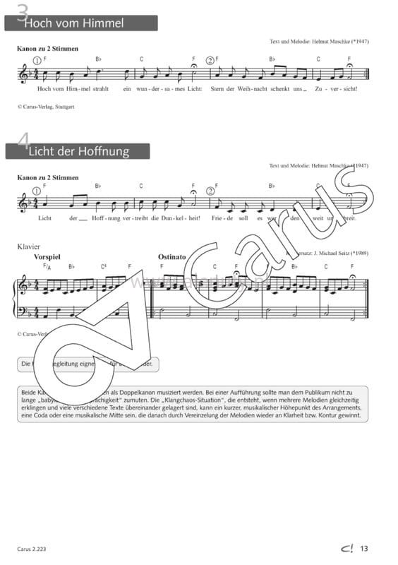 Zimowe i świąteczne aranżacje na głosy równe (S(S)A) z akompaniamentem fortepianu i opcjonalnymi instrumentami melodycznymi nadają się zarówno na koncerty szkolne, jak i do muzykowania w klasie. Jednocześnie utwory te pomagają w nauce śpiewu głosowego: kanony prowadzą krok po kroku do śpiewu wielogłosowego (homofonii i polifonii).