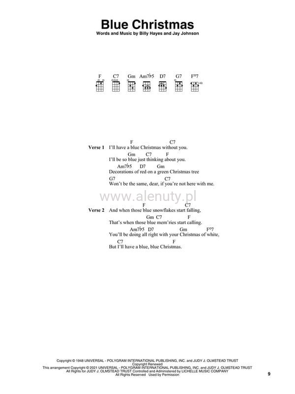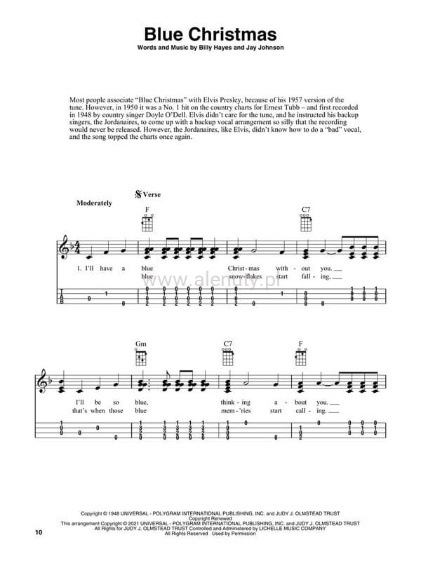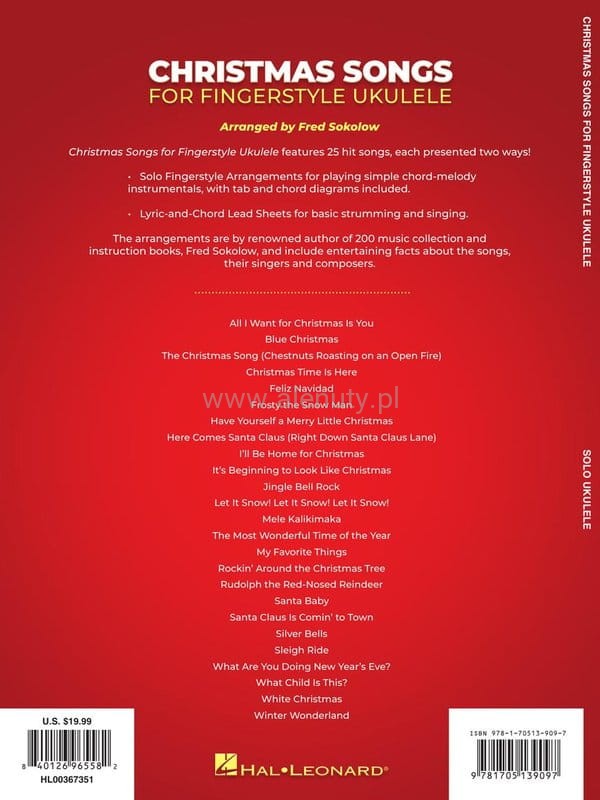 Christmas Songs for Fingerstyle Ukulele features 25 hit tunes, each presented two ways: solo fingerstyle arrangements for playing simple chord-melody instrumentals, with tab and chord diagrams included, and lyric-and-chord lead sheets for basic strumming and singing. The arrangements are by renowned author of 200 music collection and instruction books, Fred Sokolow, and include entertaining facts about the songs, their singers and composers. Songs include: All I Want for Christmas Is You · Blue Christmas · The Christmas Song (Chestnuts Roasting on an Open Fire) · Christmas Time Is Here · Feliz Navidad · Have Yourself a Merry Little Christmas · It's Beginning to Look like Christmas · Jingle Bell Rock · My Favorite Things · Rockin' Around the Christmas Tree · Santa Claus Is Comin' to Town · Silver Bells · What Are You Doing New Year's Eve? · White Christmas · and more.