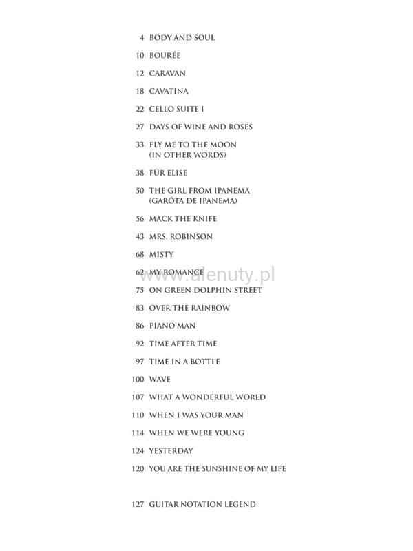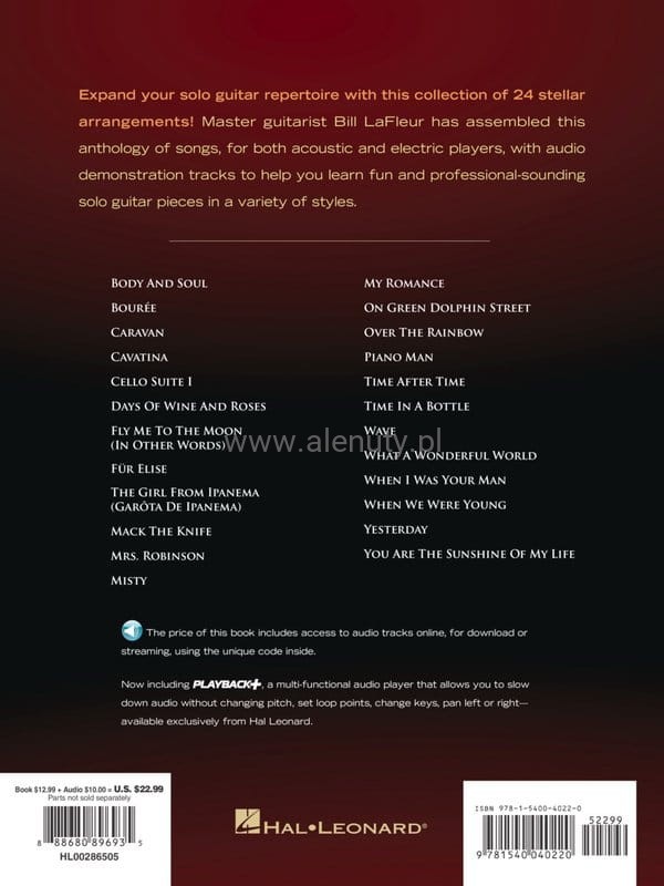 Poszerz swój gitarowy repertuar dzięki tej kolekcji 24 znakomitych aranżacji. Mistrz gitary Bill LaFleur zebrał znane standary jazzowe, ulubione utwory fingerstyle muzyki klasycznej, soulowej i popowej w antologię na gitarę akustyczną, jak i elektryczną. Zbiór idealnie sprawdzi się jako repertuar koncertowy lub ćwiczeniowy. Wydanie zawiera zapis nutowy oraz tabulatury. Nuty dla średnio zaawansowanych muzyków.