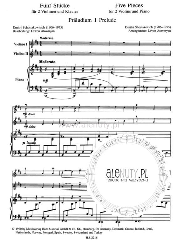 Dymitr Szostakowicz: 5 Stucke fur 2 Violinen und Klavier - Five Pieces for 2 violins and piano - nuty na dwoje skrzypiec z fortepianem