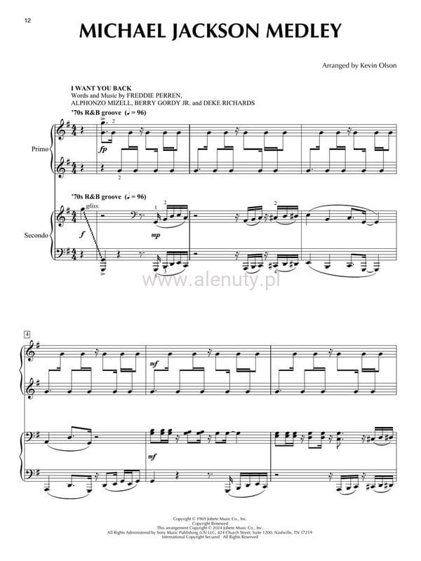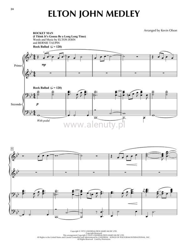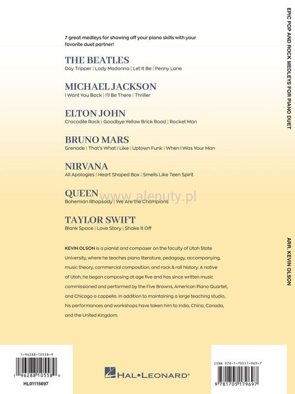 "Epic Pop and Rock Medleys for Piano Duet" to wyjątkowa publikacja opracowana przez aranżera Kevin Olsona. Zawiera ikoniczne utwory 7 niesamowitych artystów popowych i rockowych (tzw medleye), przeznaczonych do wykonania na fortepianie na 4 ręce. Książka obejmuje szeroki repertuar największych przebojów. Medleye składają się z ikonicznych utworów takich artystów jak The Beatles, Bruno Mars, Elton John, Michael Jackson, Nirvana, Queen oraz Taylor Swift. Każdy z medleyów został starannie zaplanowany i zaaranżowany, aby dostarczyć niezapomniane wrażenia zarówno dla wykonawców, jak i słuchaczy. Gra w duecie nie tylko wzmacnia umiejętności techniczne, ale także rozwija współpracę i komunikację między muzykami. Nuty przeznaczone dla średnio zaawansowanych muzyków.