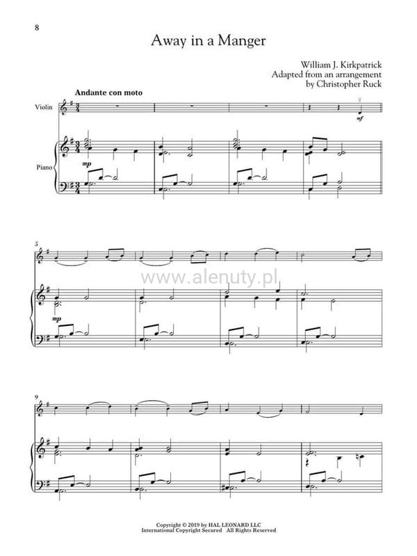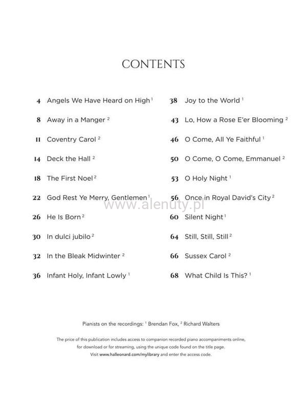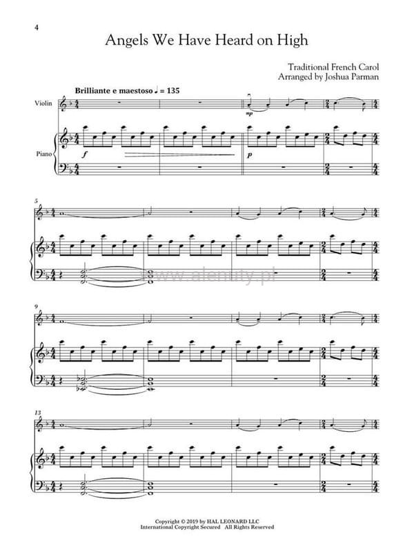 Publikacja zawiera kolekcję 20 najpiękniejszych kolęd i piosenek świątecznych opracowanych na skrzypce z towarzyszeniem fortepianu. Nuty przeznaczone dla średnio zaawansowanych muzyków. Do książki dołączony jest specjalny kod umożliwiający dostęp do materiałów muzycznych przez Internet. Dostęp możesz uzyskać za pomocą komputera, smartfonu i tabletu. Pliki audio zawierają m.in. wersje demo oraz podkłady do zagrania każdego utworu i są w cenie książki. O tym w jaki sposób uzyskać do nich dostęp przeczytasz >>> w artykule.