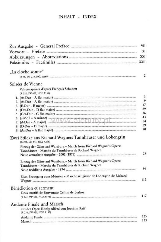 This volume contains free arrangements written by Franz Liszt in 1850-54. In addition to the nine pieces under the title Soirées de Vienne (Schubert) and five arrangements made from Wagner's operas Tannhäuser and Lohengrin, the volume contains two movements each from Berlioz and Raff, and arrangements of French and Hungarian national themes (La cloche sonne, Ungarischer Romanzero). The latter is published for the first time, making it particularly interesting. Another first appearance in print is the last, 1876 version of Einzug der Gäste auf Wartburg, which has additions and alterations on five autograph pages compared to the 1874 version, and this ''Neue vermehrte Ausgabe'' (new extended edition) was not published in Liszt's lifetime, nor has it been since. Similarly to previous volumes in the series this edition is published in hard blue clothbound and soft paper bound versions. A detailed description of the sources and the critical notes on the musical text are in the clothbound edition. Works marked by an asterisk in the Contents are published here for the first time in print.