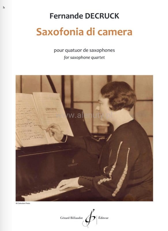 Tytuł: Saxofonia di camera pour quatuor de saxophones Autor: Fernande Decruck Instrument: saksofon Stopień trudności: dla średnio zaawansowanych Notacja muzyczna: zapis nutowy Wydawnictwo: Gerard Billaudot Editeur Format: A4, miękka oprawa Język wydania: francuski ISBN / ISMN: 9790043101550 Kod wydawcy: GB10155