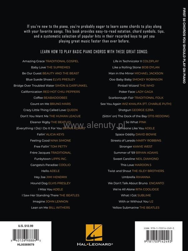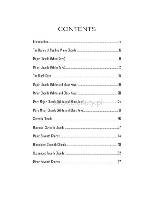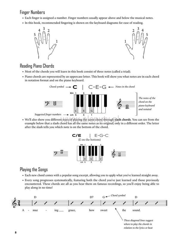 Jeśli rozpoczynasz przygodę z grą na pianinie na pewno chcesz nauczyć się kilku akordów, aby grać ulubione piosenki. Ta jedyna w swoim rodzaju publikacja zawiera łatwo dostępne, niezbędne akordy fortepianowe i progresje używane w słynnych piosenkach pop, rock, hip-hop, R&B, gospel, blues i folk. Wydanie zawiera wiele wiadomości teoretycznych z zakresu nauki i budowy akordów i wykorzystuje je w znanych melodiach. Dzięki temu oprócz teorii ćwiczysz również praktyczne wykorzystywanie akordów w muzyce rozrywkowej. Pozwoli to w szybki sposób opanować wiele utworów oraz zdobyć umiejętność świadomego grania i tworzenia progresji. Książka przeznaczona dla początkujących muzyków.