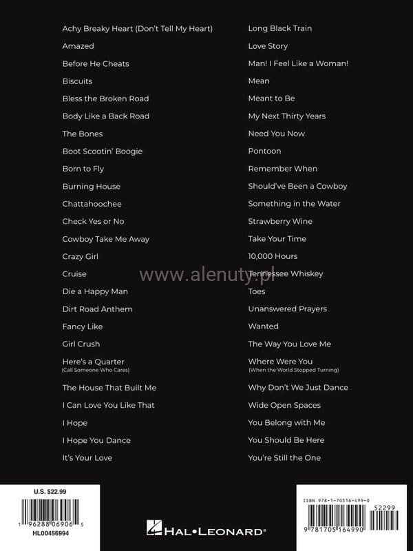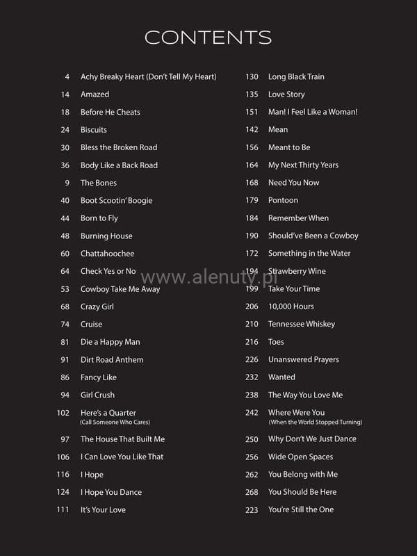 Publikacja zawiera zbiór 50 popularnych utworów muzyki country. W wydaniu znajdują się prosto zaaranżowane, obowiązkowe piosenki, które są niezbędne w repertuarze każdego gracza. Nuty opracowane na fortepian dla początkujących muzyków.