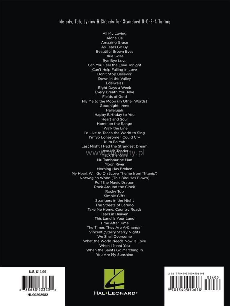 Bogata kolekcja 50 popularnych utworów zaaranżowanych w prosty sposób na ukulele. Wydanie nuty, zawiera zapis akordowy, tabulaturę oraz słowa do zamieszczonych piosenek. Książka wzbogacona jest o liczne diagramy akordowe przydatne początkującym muzykom.