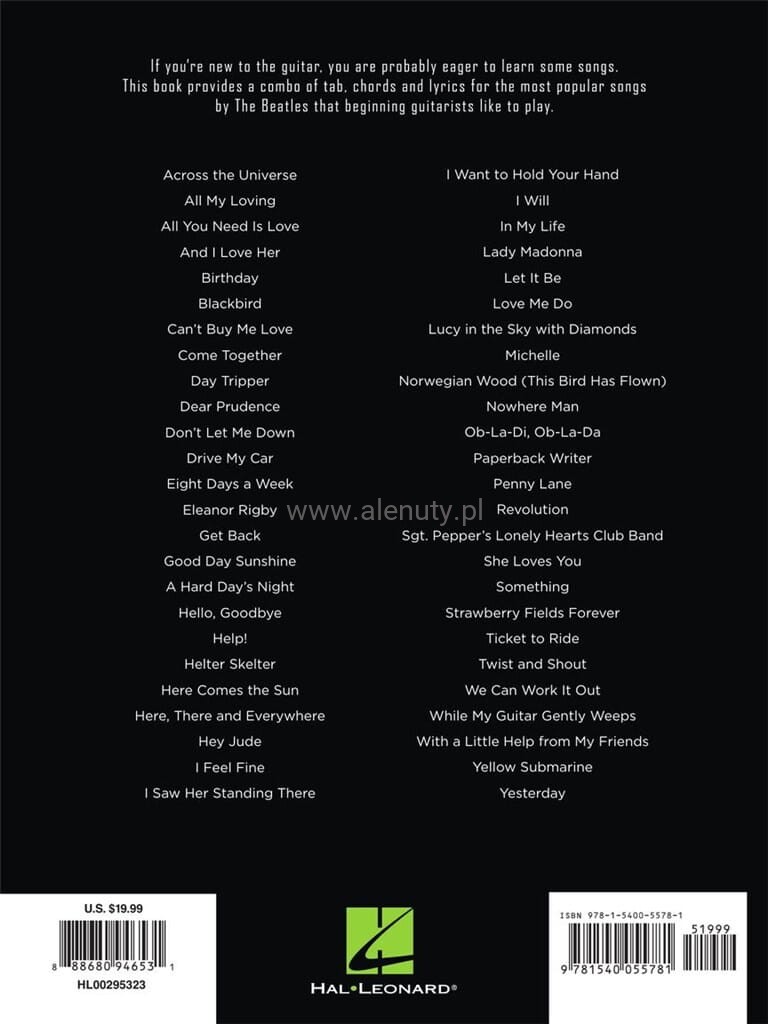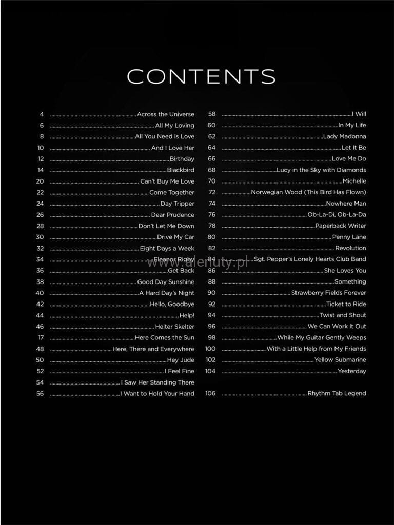 Bogata kolekcja 50 popularnych utworów zespołu the Beatles zaaranżowanych w prosty sposób na gitarę akustyczną. Wydanie zawiera zapis akordowy, tabulaturę oraz słowa do zamieszczonych piosenek. Książka wzbogacona jest o liczne diagramy akordowe przydatne początkującym gitarzystom.