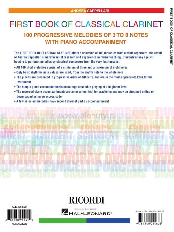 The First Book of Classical to doskonały zbiór ćwiczeń na klarnet. Zawiera on 100 krótkich melodii skomponowanych przez mistrzów klasycznego repertuaru i opracowanych przez Andrea Cappellari. Każda z melodii została starannie zaprojektowana tak, aby zawierała od trzech do ośmiu dźwięków, umożliwiając początkującym graczom skupienie się na podstawowych aspektach gry, takich jak interpretacja melodii i technika wykonania. Rytmy używane w utworach są proste, obejmując zarówno ósemki, jak i całe nuty. Kolejność utworów została zaplanowana, aby zapewnić progresywny rozwój umiejętności muzycznych.