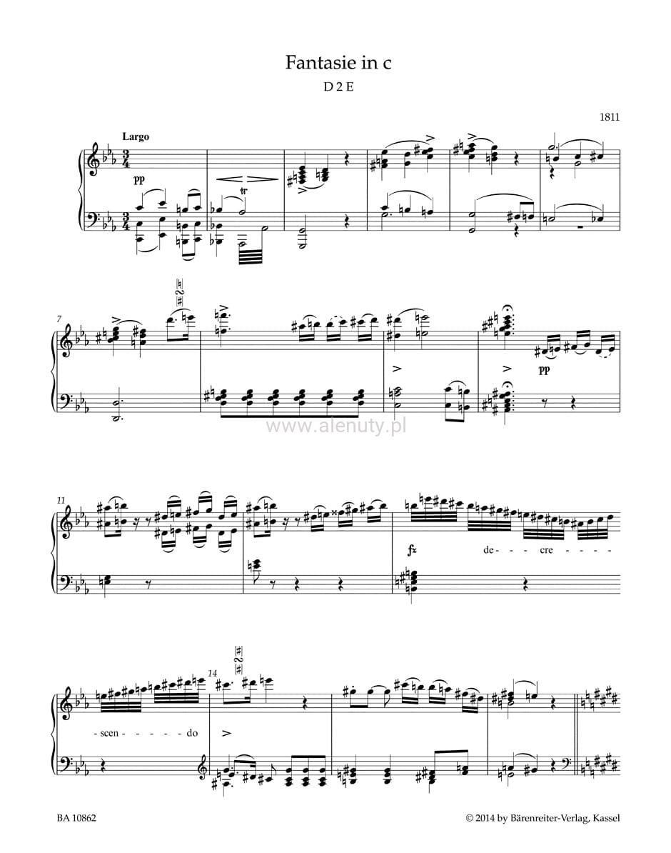 Wczesne dowody zainteresowania Schuberta muzyką przeszłości można znaleźć w jego „Fantazji c-moll” z 1811 r. (D 2 E), w której znajdują się echa fantazji Mozarta w tej samej tonacji. Powtarzający się fragment motywacyjny w wirtuozowskiej „Fantazji Graz” C-dur (D 605 A), skomponowanej prawdopodobnie w latach 1818–1821, zapowiada już monumentalną „Fantazję Wędrowca” z 1822 r. (op. 15 - D 760).Wydrukowany z nowym, obszernym grawerem numer BA 10862 łączy w jednym tomie wielkie fantazje Schuberta na fortepian solo i po raz pierwszy prezentuje wczesne dzieło „Fantasy in c-moll” w naukowo-krytycznym wydaniu Urtext. Oferuje zaawansowanym uczniom, studentom i zawodowym pianistom bogato zróżnicowany, porywający muzycznie i technicznie dodatek do ich repertuaru. Wydanie zawiera uwagi dotyczące praktyki wykonawczej, przedmowę informacyjną, praktyczne przewracanie stron i elegancką rycinę. Najsłynniejsza z fantazji, Fantazja Wędrowca, ukazuje się obecnie w osobnym wydaniu (BA 10870). Kiedy Schubert grał Fantazję Wędrowca przez kręgu przyjaciół, zawahał się i wykrzyknął niecierpliwie: Diabeł powinien grać w takie rzeczy!”Jednak to nie Diabeł, lecz Liszt – podobnie jak Schumann, wielki wielbiciel tego utworu – zaaranżował później Fantazję Wędrowca na fortepian i orkiestrę i ponownie na dwa fortepiany. To także Liszt nadał dziełu przydomek, który zachował do dziś.- Na podstawie urtekstu nowego wydania Schuberta- Pierwsze naukowo-krytyczne wydanie wykonawcze Fantazji c-moll (D 2 E)- Uwagi na temat praktyki wykonawczej (niemiecki/angielski)