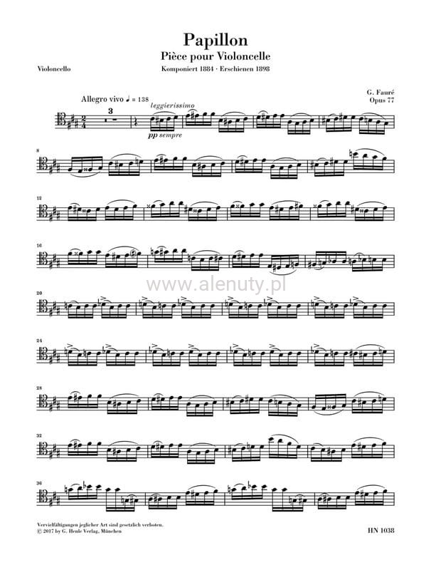 After the great success of his Élégie (HN 563), Fauré’s publisher Hamelle urged him to write another, similarly effective piece for cello and piano. Papillon was probably already composed in 1884, though it was only published in 1898. Whereas Fauré just wanted to call it “Piece for violoncello”, his publisher insisted on a more evocative title, and ultimately succeeded in giving it its present name (meaning “butterfly”). But Fauré is said to have been indignant, remarking: “Butterfly or dung fly use whatever you want”. The success of the work proved Hamelle right Papillon is today just as popular with cellists as the Élegie, and is now available as a Henle Urtext edition.
