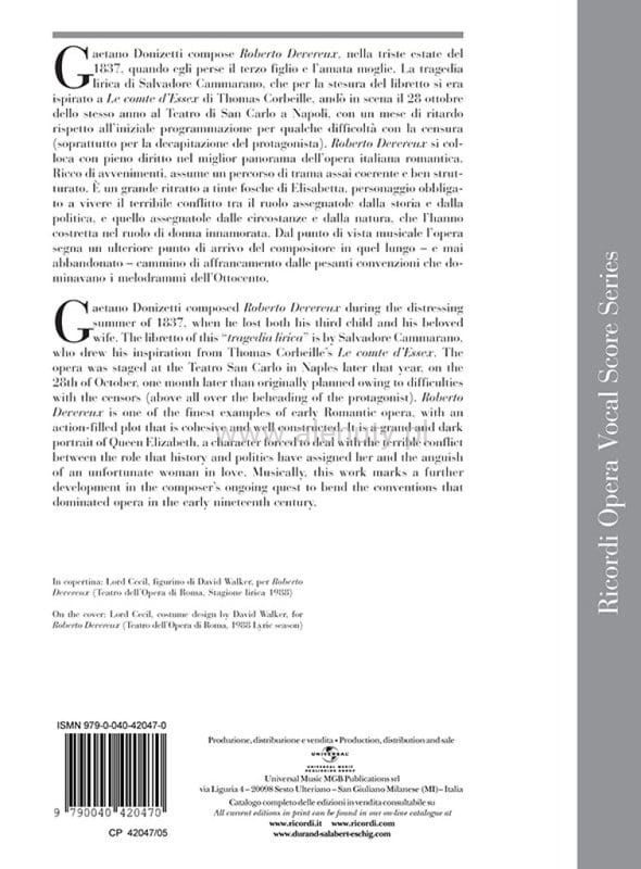 Publikacja zawiera nuty do Opery Gaetano Donizetti "Roberto Devereux" opracowane na głos, chór i fortepian. Wydanie w formie partytury wokalnej, przeznaczone dla średnio zaawansowanych muzyków.