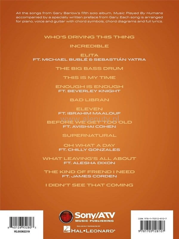 Publikacja zawiera wszystkie piosenki z piątego solowego albumu Gary'ego Barlowa - Music Played By Humans. Wydanie opatrzone specjalnie napisaną przedmową Gary'ego. Każda piosenka jest zaaranżowana na fortepian, głos i gitarę dla średnio zaawansowanych.