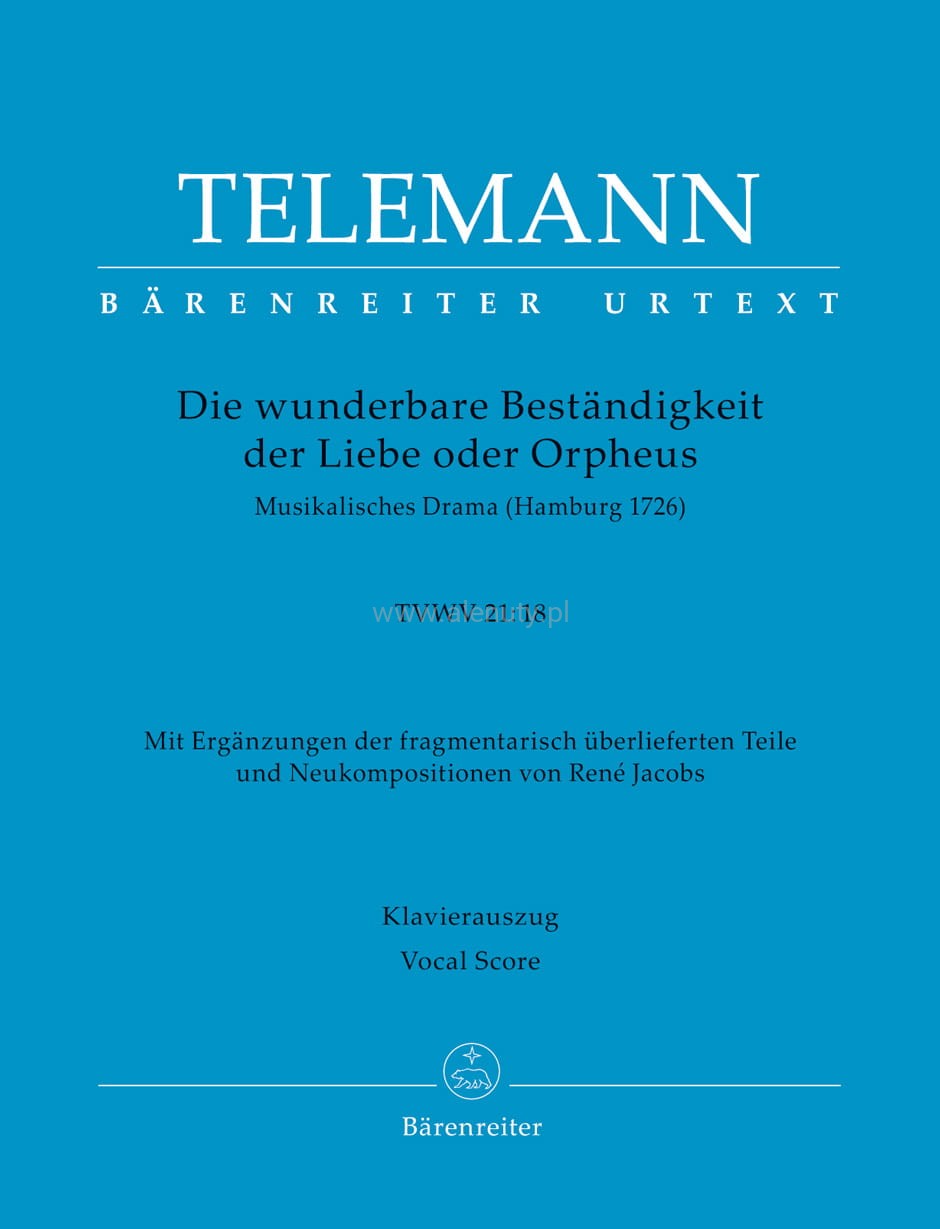 In Georg Philipp Telemann’s opera “Orpheus”, the focus is not on Eurydice, but on Queen Orasia, who is inflamed with mad but unrequited love for the legendary singer.The first documented performance of the work took place in Hamburg in 1726. In keeping with the appealing multilingualism of the libretto (German, Italian and French), the composer presents the recitatives, arias and choruses in the various national musical styles and, depending on the dramatic and scenic occasion, ranging from the songlike to the pathetic and virtuosic.The vocal score, which is based on the Urtext of the “Telemann Musical Works”, also includes editorially marked additions (including new compositions of recitatives that have only been handed down in text form) by René Jacobs, a specialist in this repertoire. - With additions by René Jacobs- Informative bilingual Foreword (Ger/Eng)- Practical, easy-to-play piano reduction.