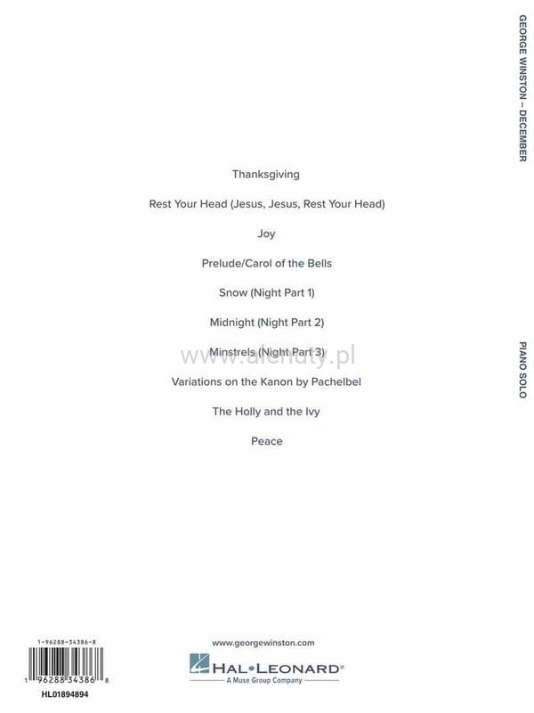 Poznaj spokojne piękno kultowego albumu George'a Winstona „December” dzięki tej autoryzowanej kolekcji dokładnych transkrypcji na fortepian solo. Zawierający uwielbiane utwory, takie jak „Thanksgiving”, „Carol of the Bells”, „Variations on the Kanon by Pachelbel” i „Peace”, ten śpiewnik oddaje delikatnego ducha i kontemplacyjną elegancję zimowego klasyka Winstona. Dzięki 10 utworom zaczerpniętym bezpośrednio z oryginalnych nagrań pianiści mogą teraz ożywić ekspresyjne niuanse i ciepło albumu „December” na własnym fortepianie. Pozycja obowiązkowa dla fanów George'a Winstona i osób poszukujących spokojnego, sezonowego repertuaru.
