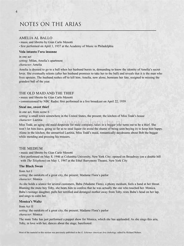 10 arias: Amelia al ballo: Vola intanto l'ora insonne • The Consul: The Foreign Woman's Aria • To this we've come • The Labyrinth: The Bride's Song • The Medium: The Black Swan;Monica's Waltz • The Old Maid and the Thief: Steal me, sweet thief • The Saint of Bleecker Street: Oh sweet Jesus; Be good to her • The Telephone: Hello! Oh, Margaret, it's you.