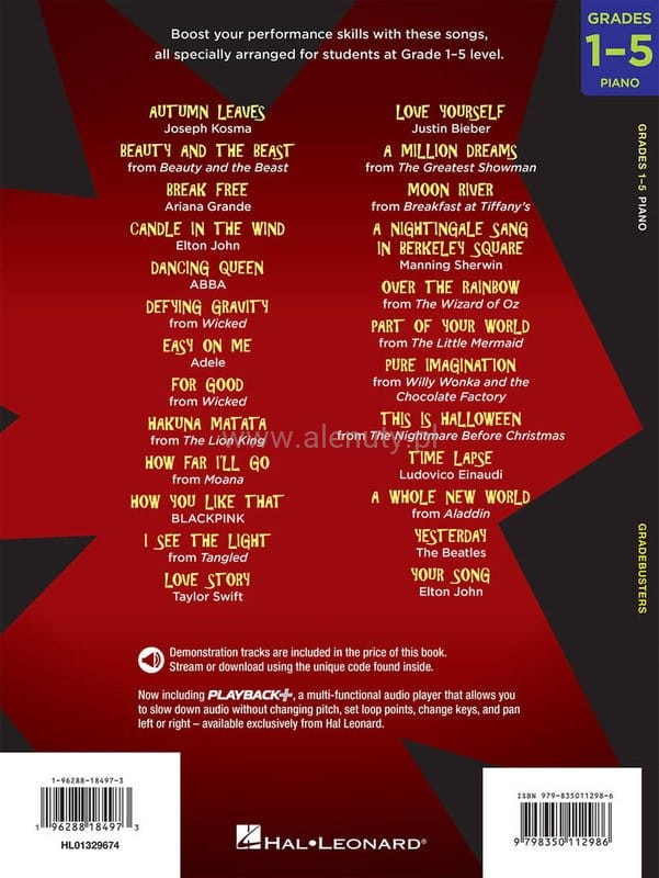 Highlights from the best-selling graded piano series, with 25 pieces all specially arranged for students at Grade 1–5 level. With six exclusive, new bonus pieces. Songs include “Love Story" (Taylor Swift), "How You Like That" (BLACKPINK), "Defying Gravity" (from Wicked), and many more. Demonstration tracks are included in the price of this book and can be streamed or downloaded using the unique code found inside. This edition includes PLAYBACK+, a multi-functional audio player that allows you to slow down audio without changing pitch, set loop points, change keys, and pan left or right - available exclusively from Hal Leonard.
