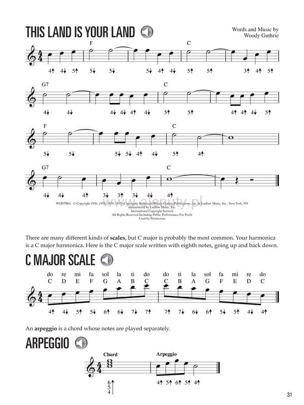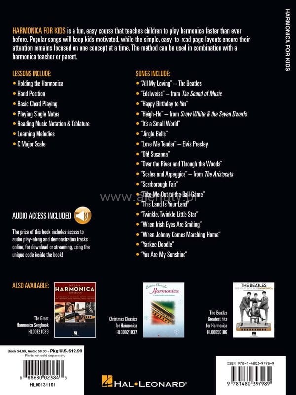 Harmonica For Kids to łatwy kurs, który uczy dzieci gry na harmonijce ustnej. Wydanie obejmuje 30 popularnych piosenek zapewniając dzieciom motywację, a prosty, czytelny układ stron sprawi, że ich uwaga pozostanie skupiona na jednej koncepcji naraz. Metoda ta może być stosowana w połączeniu z nauczycielem harmonijki lub rodzicem. Lekcje obejmują tematy dotyczące pozycji rąk, gry akordów, nauki melodii i wiele innych. Do książki dołączony jest specjalny kod umożliwiający dostęp do materiałów muzycznych przez Internet. Dostęp możesz uzyskać za pomocą komputera, smartfonu i tabletu. Pliki audio zawierają m.in. wersje demo oraz podkłady do zagrania każdego utworu i są w cenie książki. O tym w jaki sposób uzyskać do nich dostęp przeczytasz >>> w artykule.