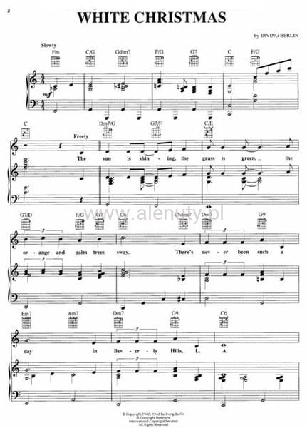 Publikacja zawiera 12 utworów wokalnych z klasycznego filmu świątecznego z 1954 roku z Bingiem Crosbym w roli głównej i ukochaną muzyką Irvinga Berlina. Wydania oznaczone jako PVG (Piano Vocal Guitar - Fortepian Melodia Gitara) zawierają zapis nutowy linii melodycznej, nuty na fortepian, akordy gitarowe oraz słowa do piosenek zamieszczonych w publikacji. Więcej o nutach PVG przeczytasz >>> w artykule