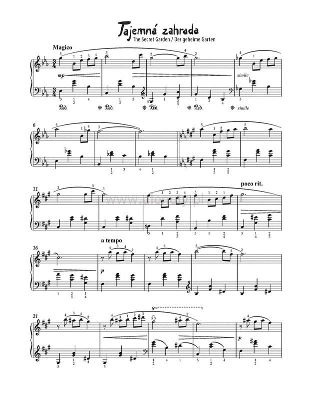 Album "The Secret Garden" Jakuba Metelki zawiera piętnaście recitalowych utworów, wiążących się z mniej wymagającym technicznie cyklem fortepianowym "Little Virtuoso". Poszczególne kompozycje w zbiorze charakteryzują się niepowtarzalnym, tonalnie zakotwiczonym stylem melodycznym Metelki, wzbogaconym o wiele niezwykłych harmonii i kolorów, co tutaj podkreśla nieco melancholijny i tajemniczy charakter tych nocnych utworów. Zabawne ilustracje Andrei Tachezy odzwierciedlają te nastroje w pomysłowy i uroczy sposób. Chociaż nie jest to tak naprawdę z góry określony cykl, piętnaście nastrojowych utworów o charakterze, z ich programowymi tytułami i ich aranżacją, opowiada rodzaj bajki, której kulminacją jest magiczna kompozycja końcowa "The Secret Garden". Nuty przeznaczone dla średnio zaawansowanych, wzbogacone o palcowania.