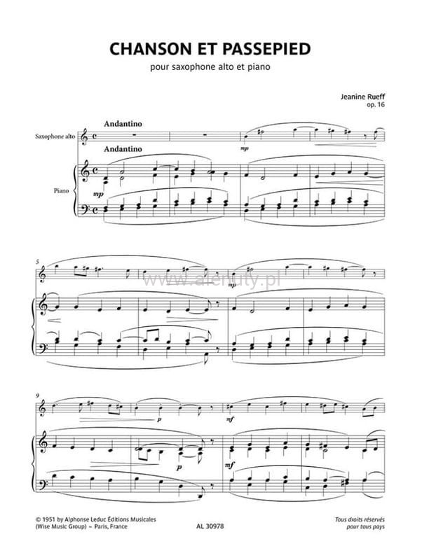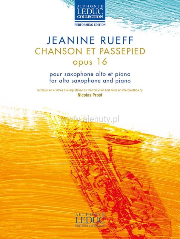Highly regarded for the finesse and elegance of her spirited, humorous writing, the composer Jeanine Rueff (1922–1999) wrote numerous works for a variety of instruments, collaborating also with the renowned Marcel Mule, a great classical saxophonist known worldwide. Among her compositions for saxophone, three which have been played throughout the globe stand out: the Concertino for alto saxophone and string orchestra (1951), the Sonate for solo alto saxophone (1967) and her Concert en quatuor (1962). A good part of her catalogue is devoted to pedagogical pieces, like this lovely Chanson et Passepied (1951) for alto saxophone and piano which has become a must for players at an intermediate (after ap¬proximately 6 years of lessons) level.