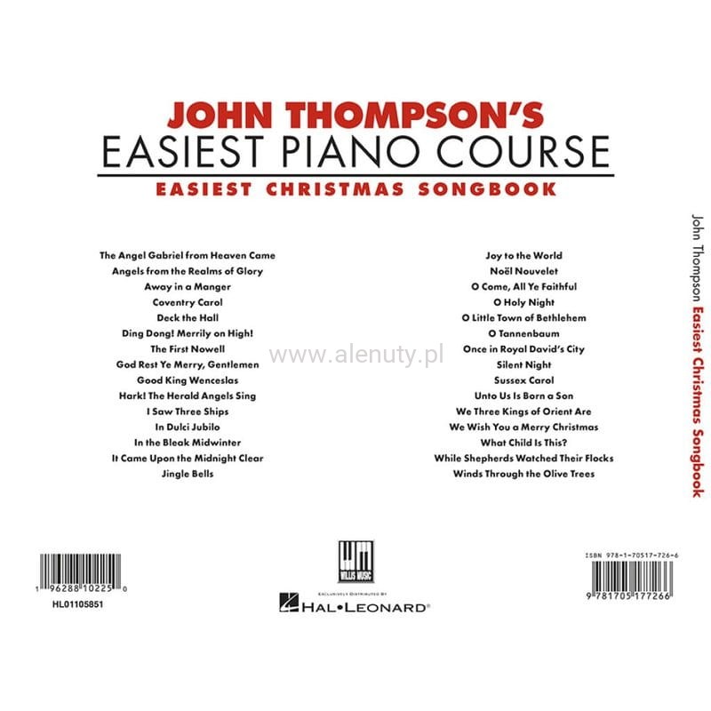 John Thompson: Easiest Christmas Songbook to publikacja, która doskonale dopełnia całość kursu Johna Thompsona. Zawiera ona zbiór kolęd i piosenek świątecznych. Wydanie mieści w sobie melodyjne kompozycje, które nie tylko wzmocnią podstawową technikę ucznia i jego muzykalność, ale także wprowadzą słuchaczy w wyjątkowy świąteczny nastrój. Nuty przeznaczone dla początkujących muzyków.