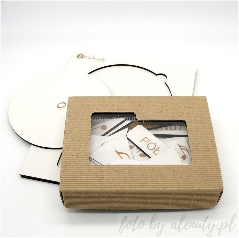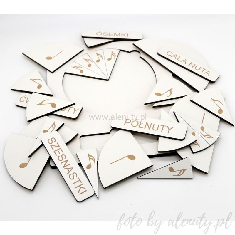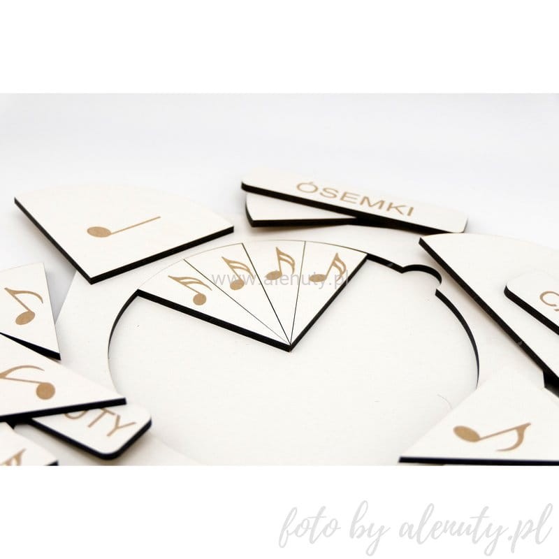 Drewniane koło rytmiczne pomoże utrwalić wartości rytmiczne nut oraz rozwinąć naturalne zdolności muzyczne dziecka. Układanka wspiera też naukę podstaw muzyki poprzez ćwiczenie poczucia rytmu i śpiewu w określonej tonacji. Dodatkowo pozwala zwiększać precyzyjność ruchową i słuchową. Zestaw składa się z drewnianej tabliczki z wygrawerowanymi laserowo wartościami rytmicznymi nut oraz ich nazwami. Nuty jak również ich nazwy znajdują się na wyciąganych tabliczkach, które łatwo można wyjmować i modyfikować. Wartości rytmiczne wygrawerowane są na wycinkach koła dzięki czemu można układać nuty w dowolnej konfiguracji i jednocześnie zachować prawidłowy ich podział.