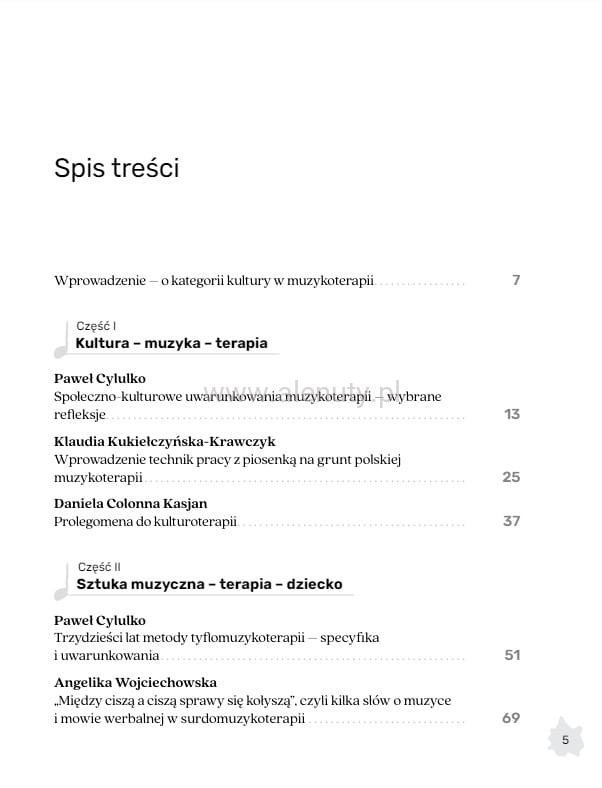 Publikacja ta to drugi tom serii „Dźwięk – Muzyka – Terapia". Zawiera wprowadzenie do muzykoterapii kulturowej, ukazując, jak kultura wpływa na terapię muzyczną. Traktując kulturę jako źródło działania, podkreśla sposób, w jaki ludzie rozwijają swoje możliwości przez uczestnictwo w społeczeństwie. Kultura jest bowiem integralnym elementem interakcji międzyludzkich i kreatywności. Książka oferuje artykuły specjalistyczne, obejmujące prace naukowe i praktyczne dotyczące różnych aspektów muzykoterapii. Zawiera również praktyczne narzędzia, takie jak śpiewniki oraz metody terapii dla dzieci i dorosłych. Dostrzeżenie i zrozumienie kwestii uwikłania muzykoterapii w kontekst kulturowo-społeczny pozwala na efektywniejsze i skuteczniejsze oddziaływanie pomocowe w służbie potrzebującemu człowiekowi.