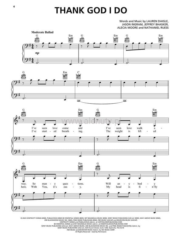 Publikacja zawiera wszystkie 10 piosenek z zatytułowanego "Thank God I do" albumu 2023 piosenkarki i autorki tekstów Lauren Daigle. Utwory z gatunku współczesnej chrześcijańskiej muzyki religijnej. Wydania oznaczone jako PVG (Piano Vocal Guitar - Fortepian Melodia Gitara) zawierają zapis nutowy linii melodycznej, nuty na fortepian, akordy gitarowe oraz słowa do piosenek zamieszczonych w publikacji. Więcej o nutach PVG przeczytasz >>> w artykule