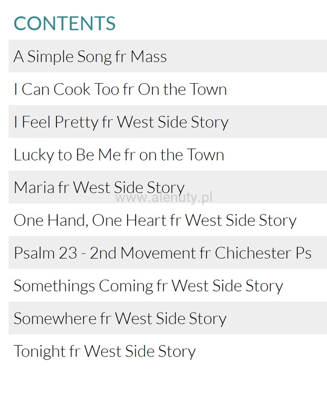 Now you can play your favourite tunes from Bernstein's shows, musicals and operettas! These collections feature all the most memorable themes idiomatically arranged for intermediate level woodwind and brass players. "I am delighted with this as it crosses the boundary of ‘classical’ to ‘light’ music very successfully ... useful for players of grade 3+ to get a feeling for light music and Bernstein’s genius for tune writing ... I would buy it. Beautifully printed too." /Review 1998/. Contents: Maria (West Side Story) · Tonight (West Side Story) · Somewhere (West Side Story) · Psalm 23 (Chichester Psalms) · A Simple Song (Mass) · There is a Garden (Trouble in Tahiti) · Lucky to be Me (On the Town) · I Can Cook Too (On the Town) · Oh, Happy We (Candide) · One Hand, One Heart (West Side Story) · Something's Coming (West Side Story).