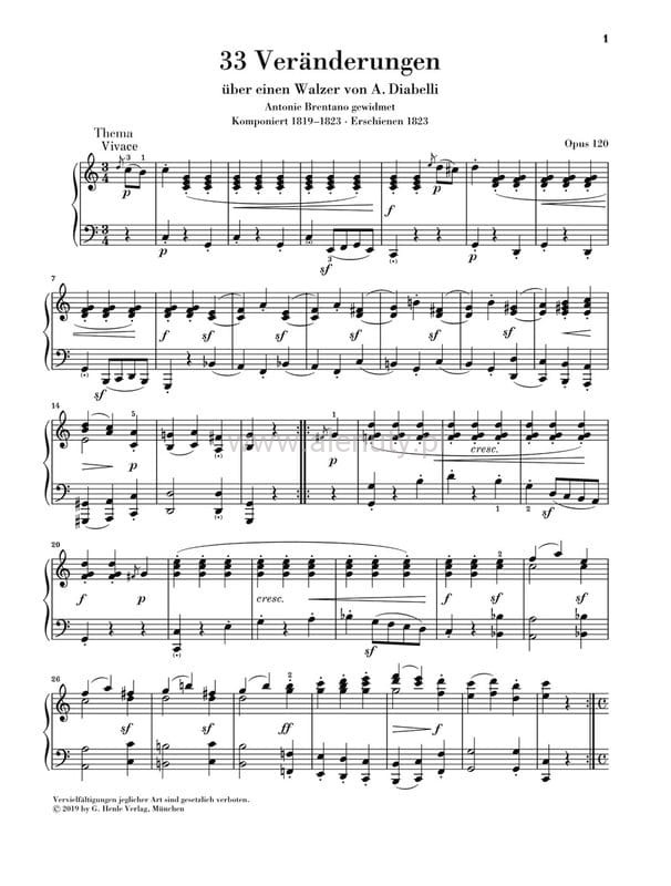 Publikacja zawiera 33 wariacje op. 120 na temat walca A. Diabellego autorstwa Ludwiga van Beethovena. Utwory skomponowane w latach 1819-1823, są jego najbardziej znaczącym wkładem w ten gatunek. W ogłoszeniu zapowiadającym publikację pierwszego wydania trafnie stwierdzono, że "nie są to zwykłe wariacje, ale wielkie i ważne arcydzieło". Wiedeński wydawca Anton Diabelli poprosił 50 kompozytorów o napisanie po jednej wariacji na temat jego walca w celu publikacji w antologii. Zamiast tego Beethoven wykorzystał je do kompleksowej eksploracji tradycji gatunku. Niniejsze wydanie Urtext, poprawione na podstawie raportu krytycznego Beethoven Complete Edition, jest samodzielnym wydaniem zaczerpniętym z tomu Variations for Piano II (HN 1269). Szczegółowa przedmowa i komentarz dostarczają informacji na temat aktualnego stanu badań. Palcowania są autorstwa Iana Fountaina. Nuty przeznaczone dla zaawansowanych pianistów.