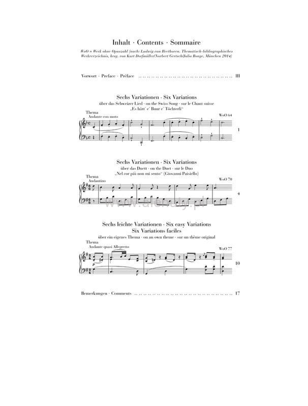 The compositions united here provide a good overview of the diversity of the variation genre in Beethoven’s early piano works and present such moderate technical demands that even advanced beginners might try their hand at them. Beethoven found the models for these variations in popular song collections (WoO 64 on a Swiss song), contemporary opera performances (WoO 70 on “Nel cor più non mi sento” by Giovanni Paisiello), and his own compositions (WoO 77 on a theme from the finale of Piano Sonata op. 22). The revised musical text of the Henle Urtext edition, with its extensive preface and commentary section, was prepared on the basis of the Critical Report in the BeethovenComplete Edition and is published as a stand-alone edition from “Variations for Piano I/II” (HN 1267 and 1269). Ian Fountain provided the fingerings.