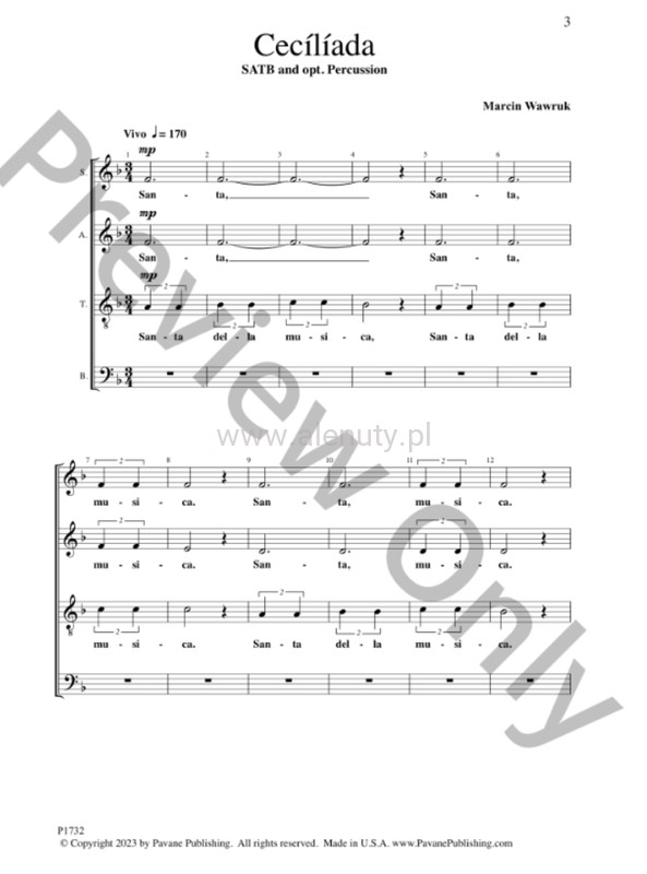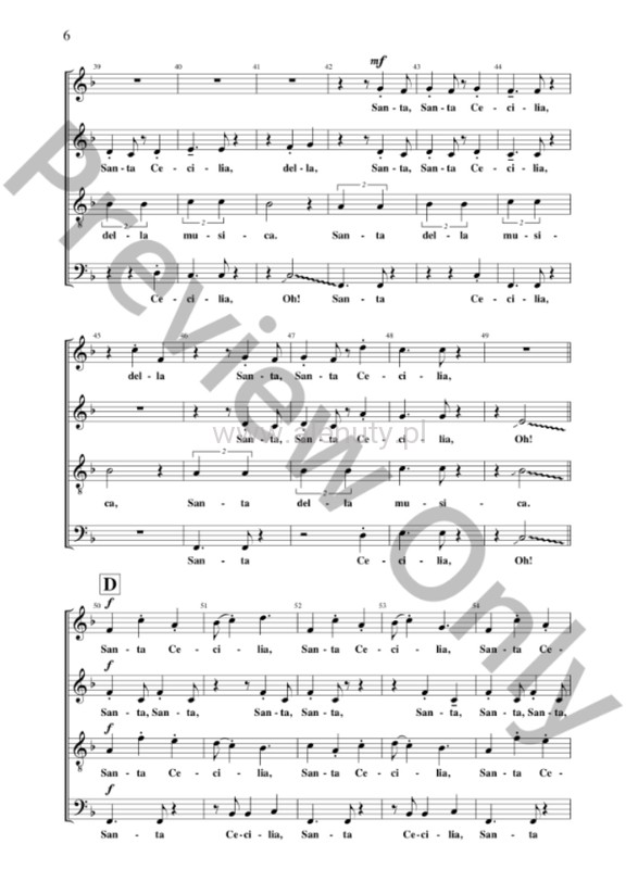 The patron saint of music, St. Cecilia, receives an energetic tribute with this delightful piece. It is one of those pieces that dances and sounds more complicated than it really is. No one will deny its joy. For high school to college and community choirs.