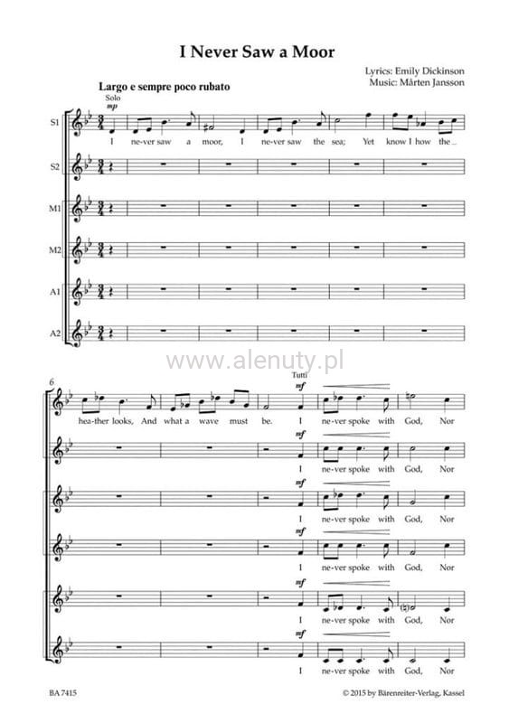 Marten Jansson: I Never Saw A Moon for SSMMAA Choir - nuty na chór żeński