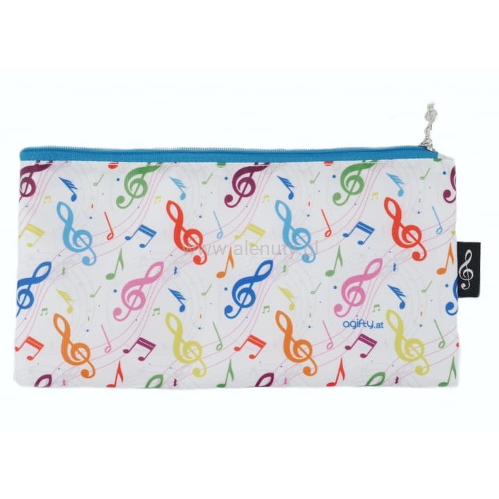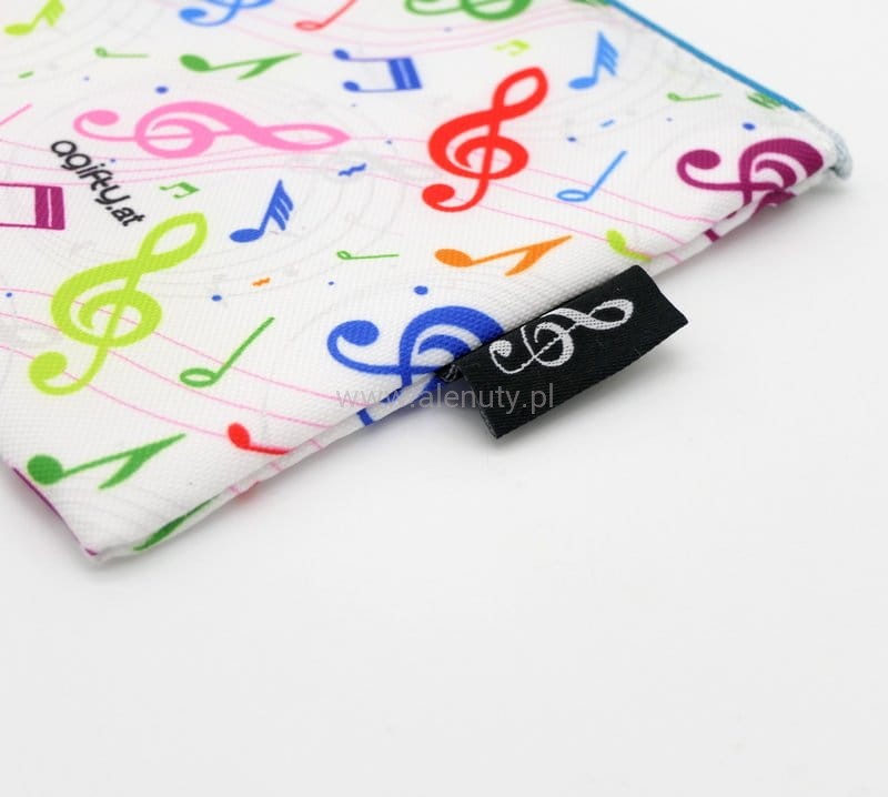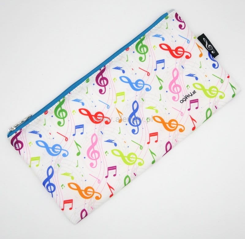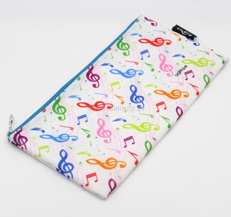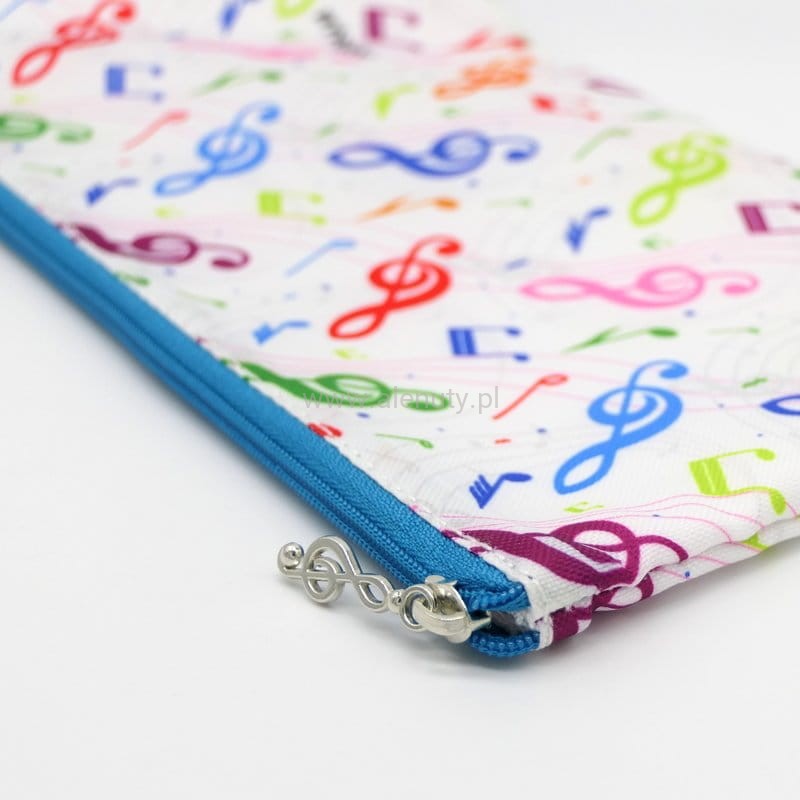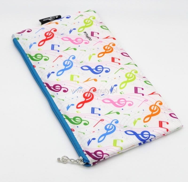 Materiałowy piórnik prostokątny biały w kolorowe nuty klucz wiolinowy 24x12.5cm zapinany na zamek